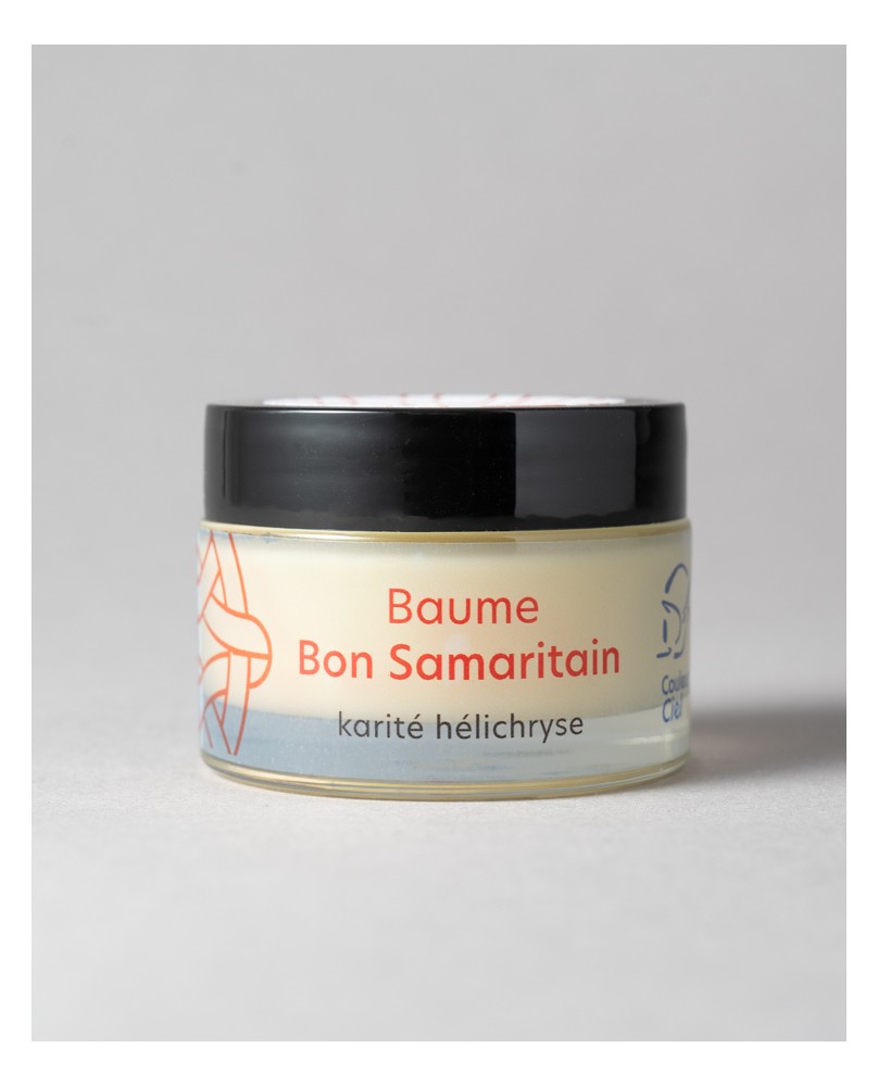 Ingrédients : beurre de karité, huile d’olive, macérâts huileux d’hélichryse, de racine de consoude et de calendula, cire d’abeille, huiles essentielles de lavande maillette, tea tree, hélichryse italienne, tocophérols (Anti-oxydant naturel).